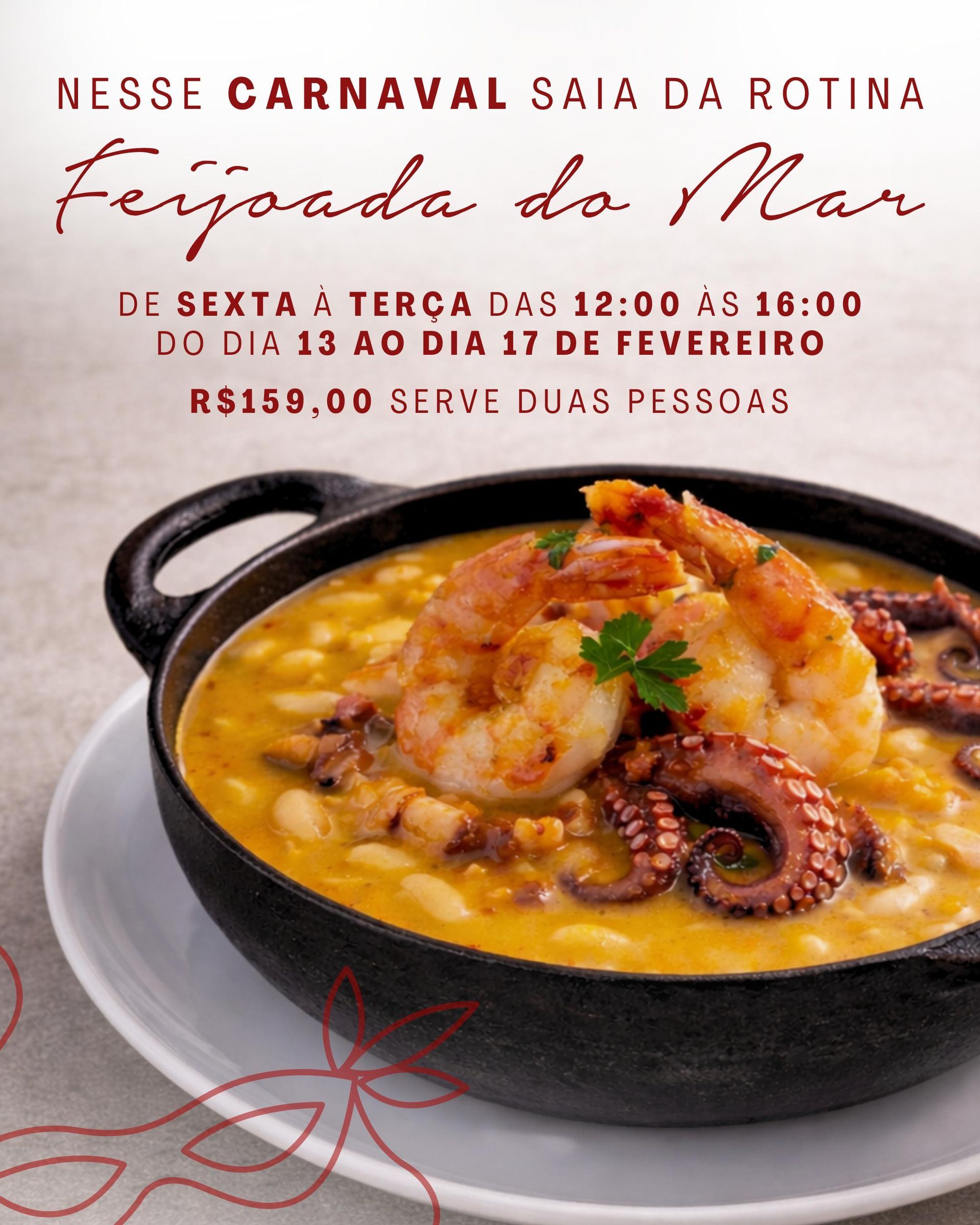 📅 Data da Feijoada de Frutos do Mar: de sexta dia 13 à terça dia 17 de fevereiro